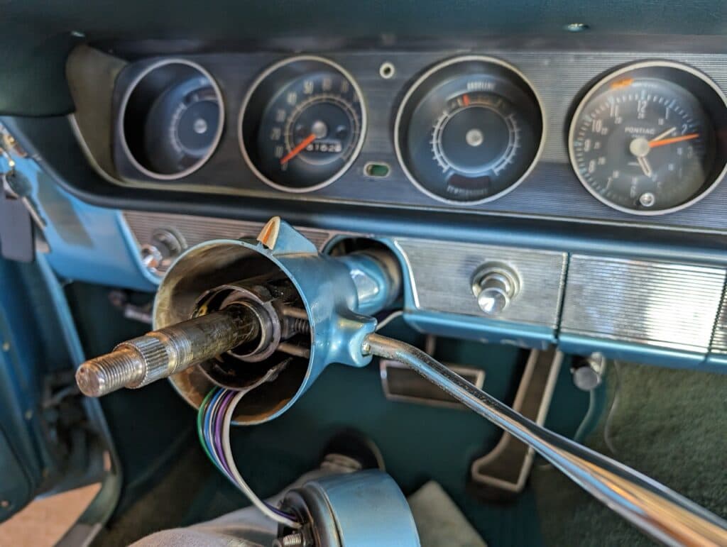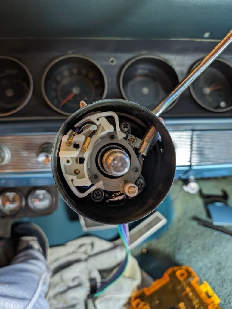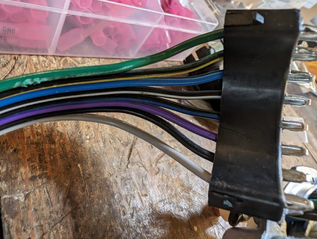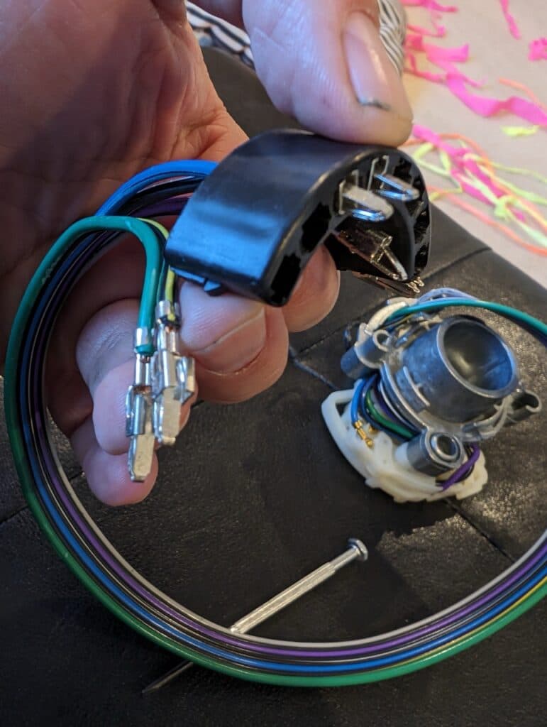 For years, the turn signal lever was lose and it finally stopped working completely. I replaced it with a new switch. This was a bit more difficult than I thought it would be, until I found a tip online that helped tremendously. The difficult part was that the new connector (black, u-shaped) was too big to fit down the steering column. I tried to force it down the column, getting close but never through. The trick I discovered was to back the pins out of the new connector, slide them through the column, then push them back into the connector. You can see the pins backed out below. They should sell the part with the pins out.