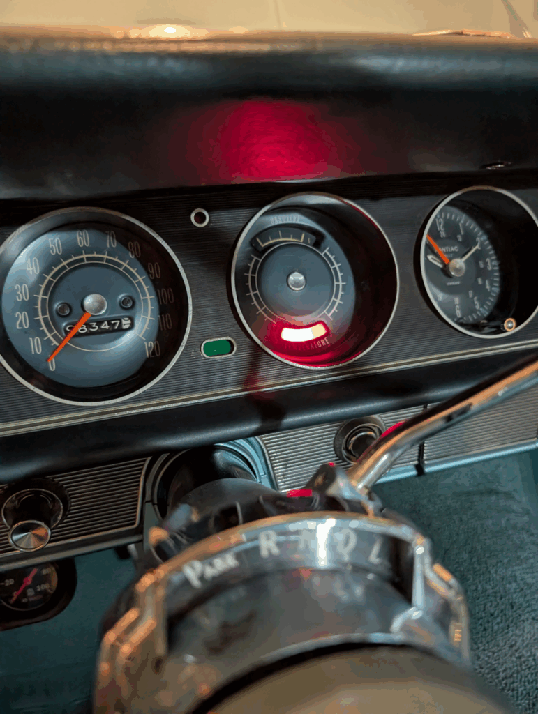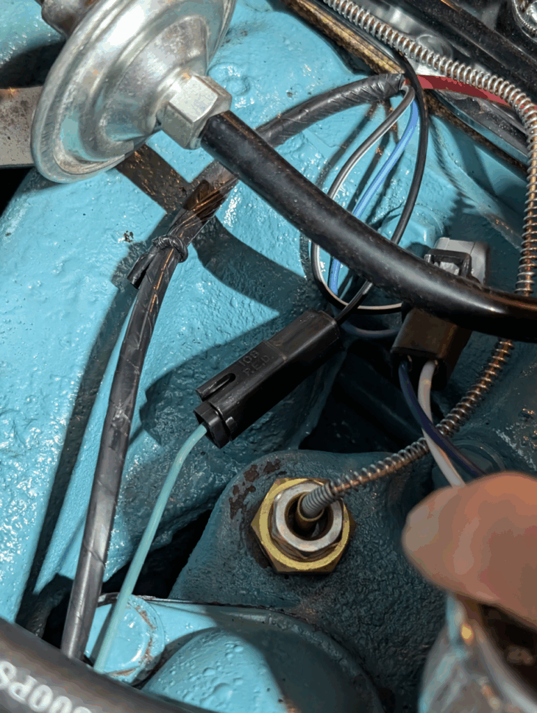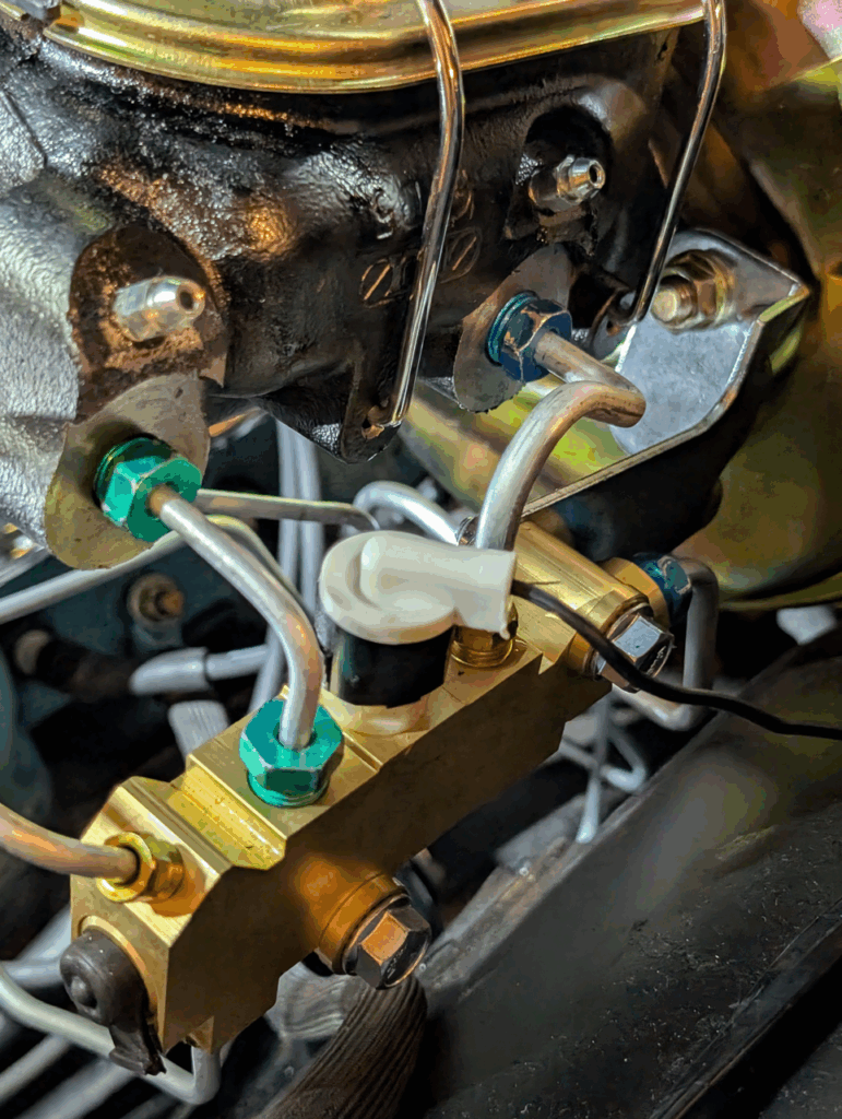 The proportioning valve came with a sensor connection that grounds when brake pressure fails to either the front or rear circuits – perfect for triggering a warning light. Since the original temperature sensor connector was now available, I simply wired it to the proportioning valve’s sensor output. Now if I experience brake pressure loss to either circuit, the temperature warning light illuminates on the dash.