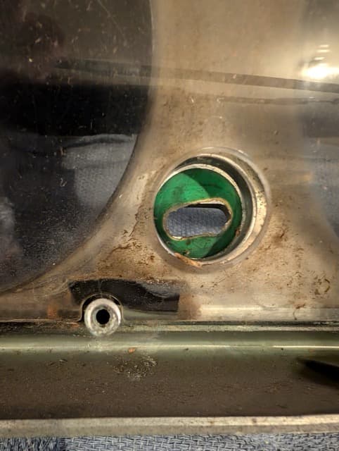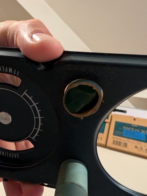While replacing the dash harness, it felt like the perfect opportunity to pop out the gauge cluster and finally fix the cracked green turn signal indicator lens. I had tried to replace it years ago without removing the cluster, and while that attempt was better than nothing, the results weren’t exactly ideal. The hardest part turned out to be sourcing—or more accurately, _creating_—a suitable lens. I bought a replacement, but once installed, it was nearly transparent (see pic below), which made the bulb completely visible and ruined the original look. After doing some research and talking with a few others who’d run into the same problem, the consensus was clear: if you want it to look right, you have to make your own. In the end, I used a green plastic binder from Staples, cut to the same size as the original round lens. It diffused the light perfectly and looks just like it should.